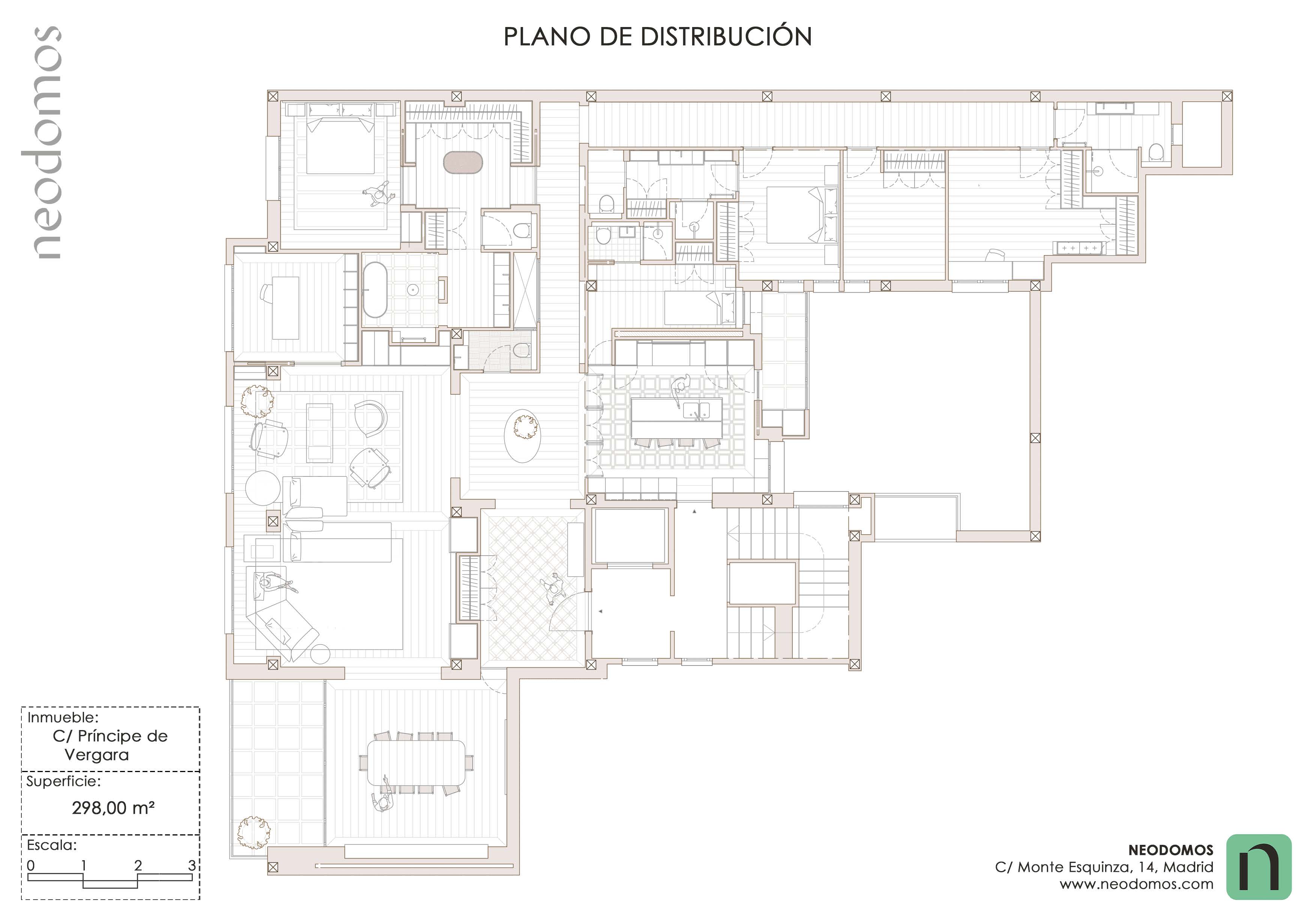 Se accede a la vivienda por un gran recibidor con paredes paneladas en madera y un armario gabanero, que distribuye las diferentes zonas. La zona social, muy luminosa y con orientación oeste, cuenta con tres ventanales, dos amplios salones, un despacho independiente, un comedor y acceso a una espaciosa terraza con vistas a Príncipe de Vergara.